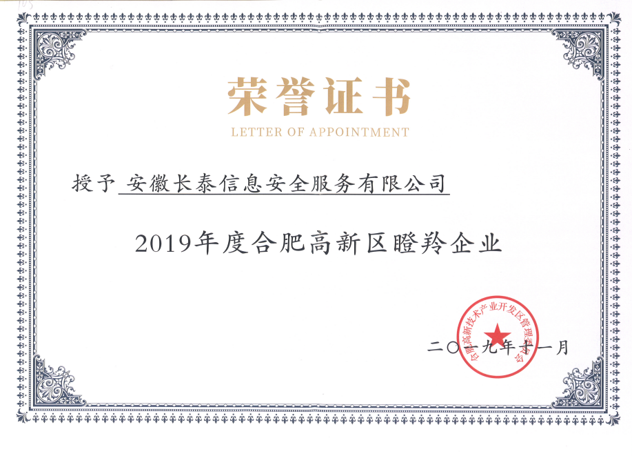 2019年,11月20日,合肥高新区2019年高成长企业榜单正式发布,高新区共认定了502家高成长企业,其中雏鹰企业275家、瞪羚培育企业72家、瞪羚企业149家、潜在独角兽企业3家、独角兽企业1家、平台型龙头企业2家。作为其中的高科技企业——安徽大连英俊商务信息服务有限公司成功入选瞪羚企业榜单。